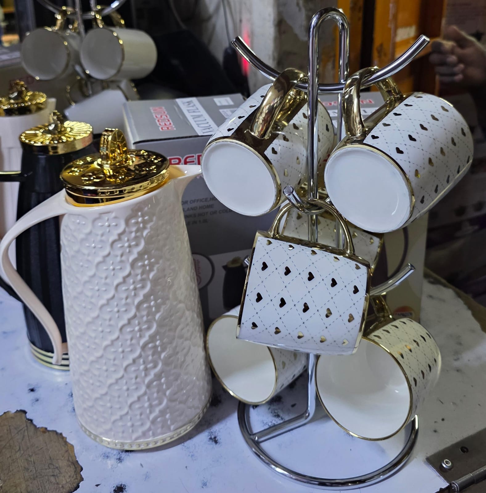 The Stylish Gold Vacuum Flask set will improve your kitchen and travel need. Designed to keep your drinks hot or cold for hours, this high-quality 1L vacuum flask with six matching mugs is perfect for outdoor activities, picnics, the office, and family use.