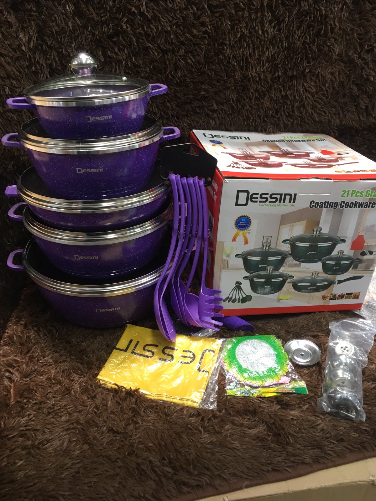 Featuring a classy and elegant design, the?Dessini 21Pcs Imperial?Original?Die-Cast Cookware Set?is the perfect accompaniment to your cooking tasks and dining table ware. Made from high quality aluminum?and featuring a unique granite finish. These cookware set are a reflection of sheer style and function. The handles of these cookware set are molded?from the main body itself and this lack of rivets leads to better durability and long-lasting performance.